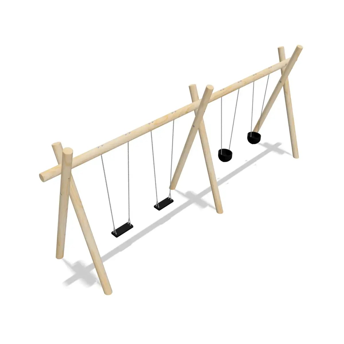 This twin-bay swing features belt seats in a high-frame design that allows for extended arc and higher swings, giving children the classic thrill of pumping legs to reach greater heights while developing coordination, core engagement, spatial awareness, and sensory regulation through soothing back-and-forth motion. The belt seats provide secure, comfortable support suitable for a range of abilities, making it accessible and inviting for individual or side-by-side play that encourages communication, turn-taking, and mutual cheering. Ideal for creating dynamic motion zones in playgrounds, it suits the 3-12 age group and handles up to 4 tamariki simultaneously, fostering whanaungatanga as they coordinate swings or wait their turn. Constructed from robust, sustainable wood that endures our coastal salt, rain, and UV exposure with natural resilience, the equipment blends seamlessly into any taiao and adds timeless, high-engagement value with low maintenance. The larger safety area accommodates the extended swing paths of a high design, ensuring safe use on sites like school playgrounds, council reserves, or landscape projects while delivering joyful, full-body movement that supports overall hauora in a secure environment.