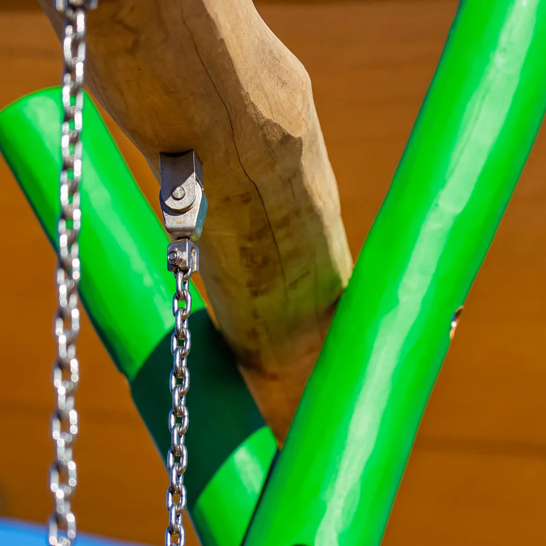 Constructed from robust, weather-resistant timber sourced sustainably with hot-dipped galvanised brackets, steel chains, aluminium components, and plastic caps for enhanced durability and corrosion resistance, the setup measures 7.9 by 6.55 metres. It offers a spacious yet efficient footprint that fits seamlessly into space-limited environments, ensuring safe, consistent thrills with minimal wear over time and easy integration into existing play zones, tailored for landscape architects NZ.
