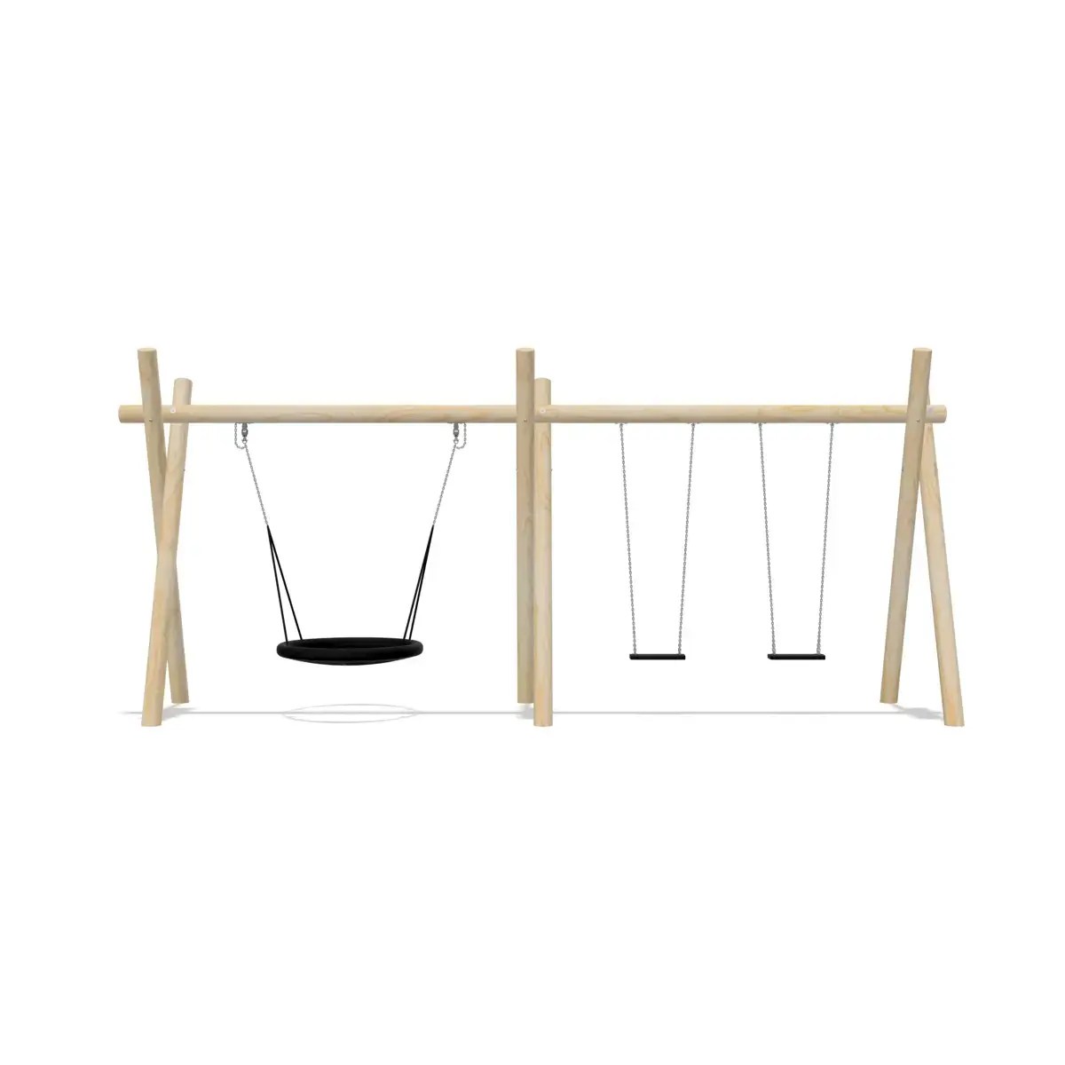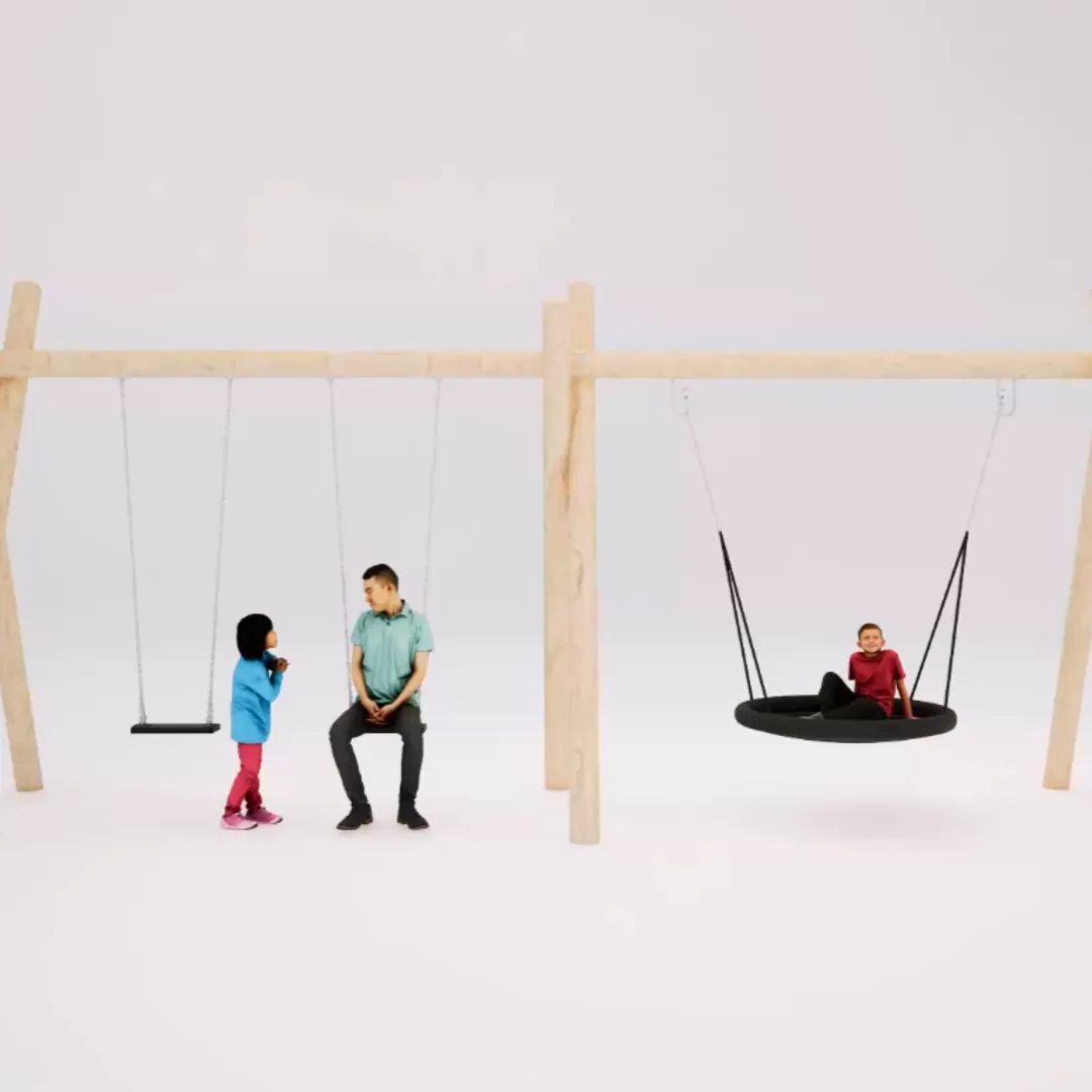 The 2 Bay Swing with a basket and belt and infant seat forms a dynamic sensory swing experience, featuring supportive belts and sturdy steel chains for secure cradling. For children aged 3 to 12, this setup allows up to six users to sway, rock, and explore in tandem in an engaging test of balance, coordination, and core strength that supports physical education goals in school outdoor play areas. Its low-profile design and natural wood finish create a calming oasis amid the playground buzz.