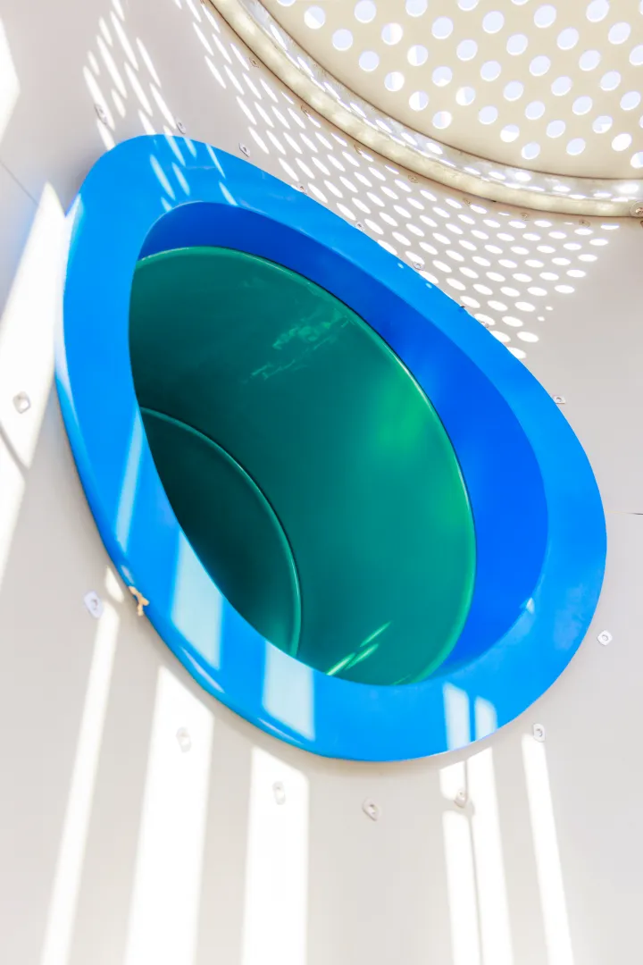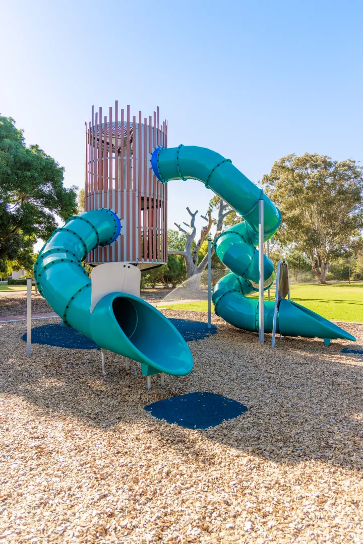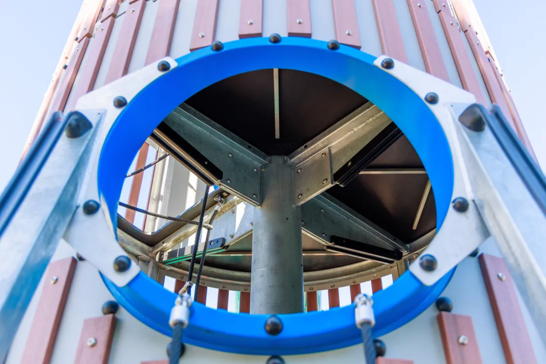 This tall play tower stands 5.7 metres high, creating an eye-catching focal point for parks and public spaces. It offers climbing opportunities combined with a large twisting slide for exciting descents. The design maximises play in a compact footprint while enhancing visual appeal and encouraging adventure for children of various ages and abilities.