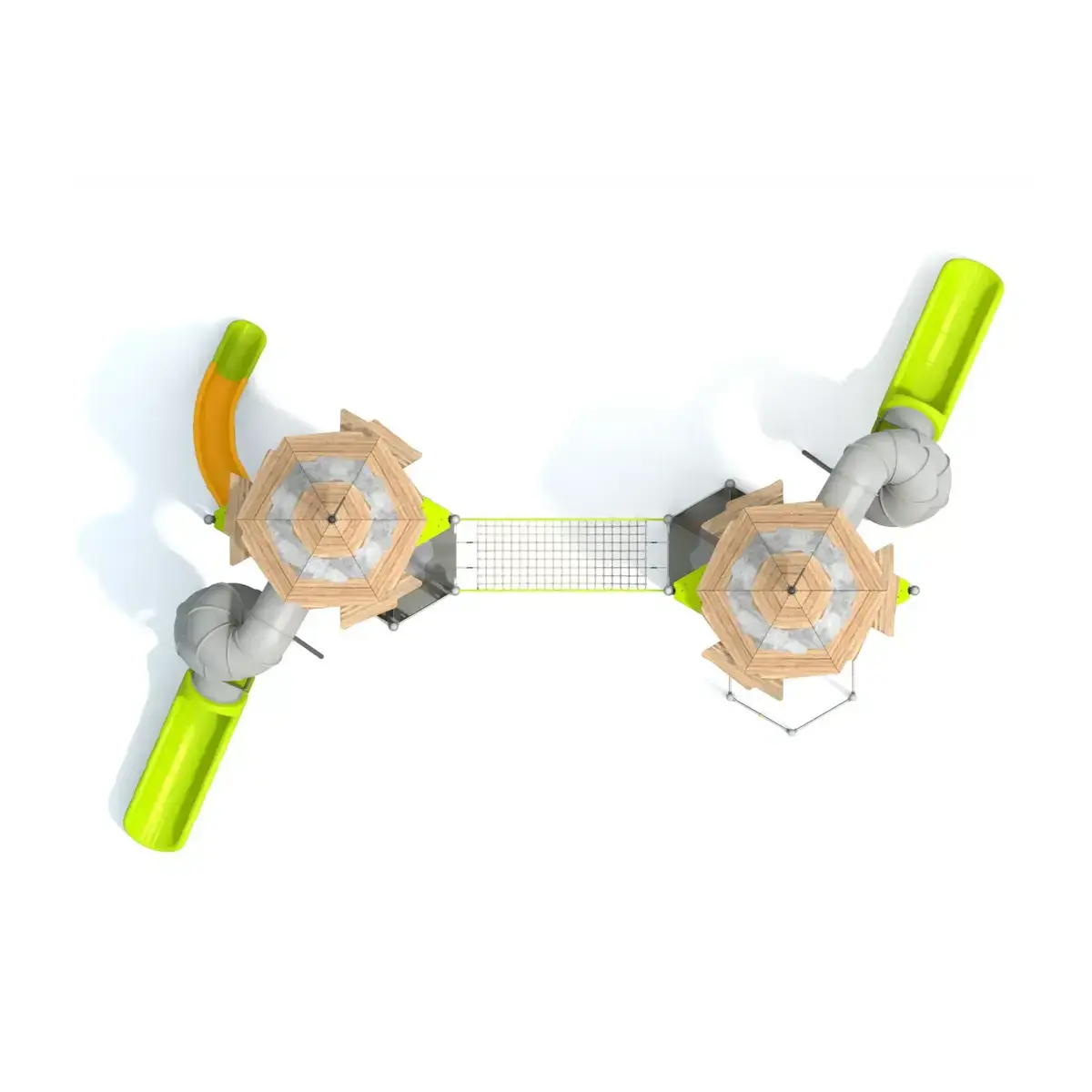 Steel structures, HDPE climbing walls and panels, stainless steel elements, recycled materials |