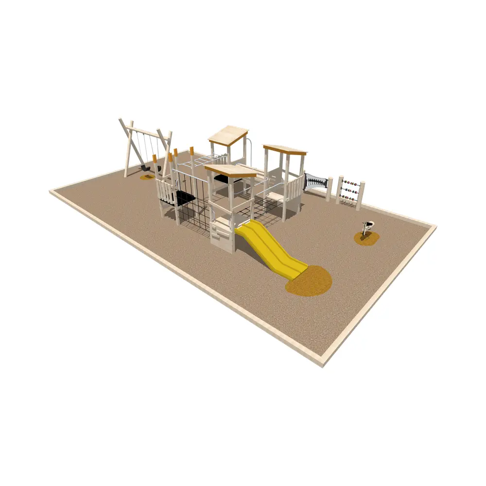 This Complete Playground Package delivers a balanced, inclusive play space for tamariki aged 1–12. It combines adventurous climbing in the West Beach Fort with sensory and social elements like the Robinia Abacus and Music Play Panels, a Junior Swing Bay for safe swinging, and a Bike Springer for active fun.