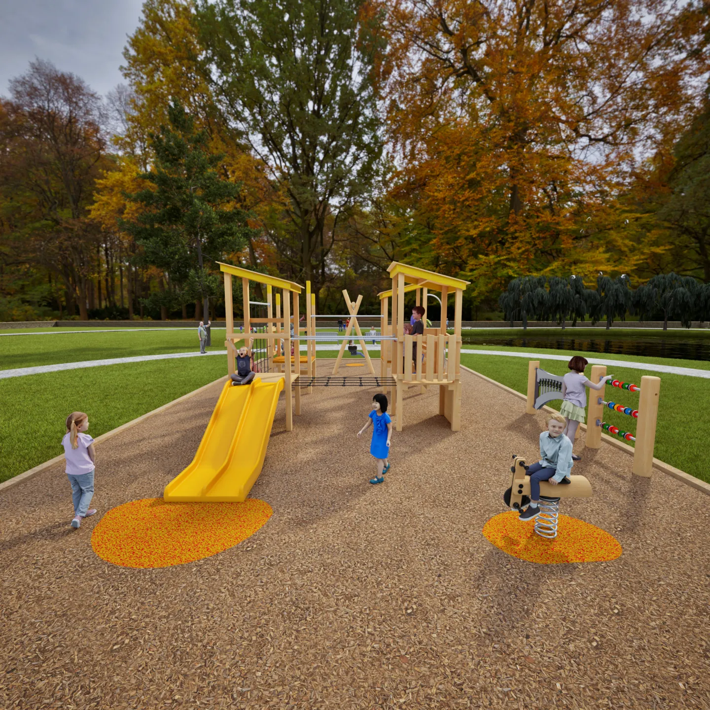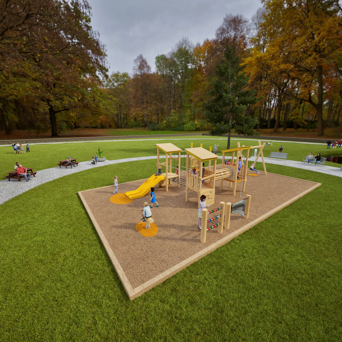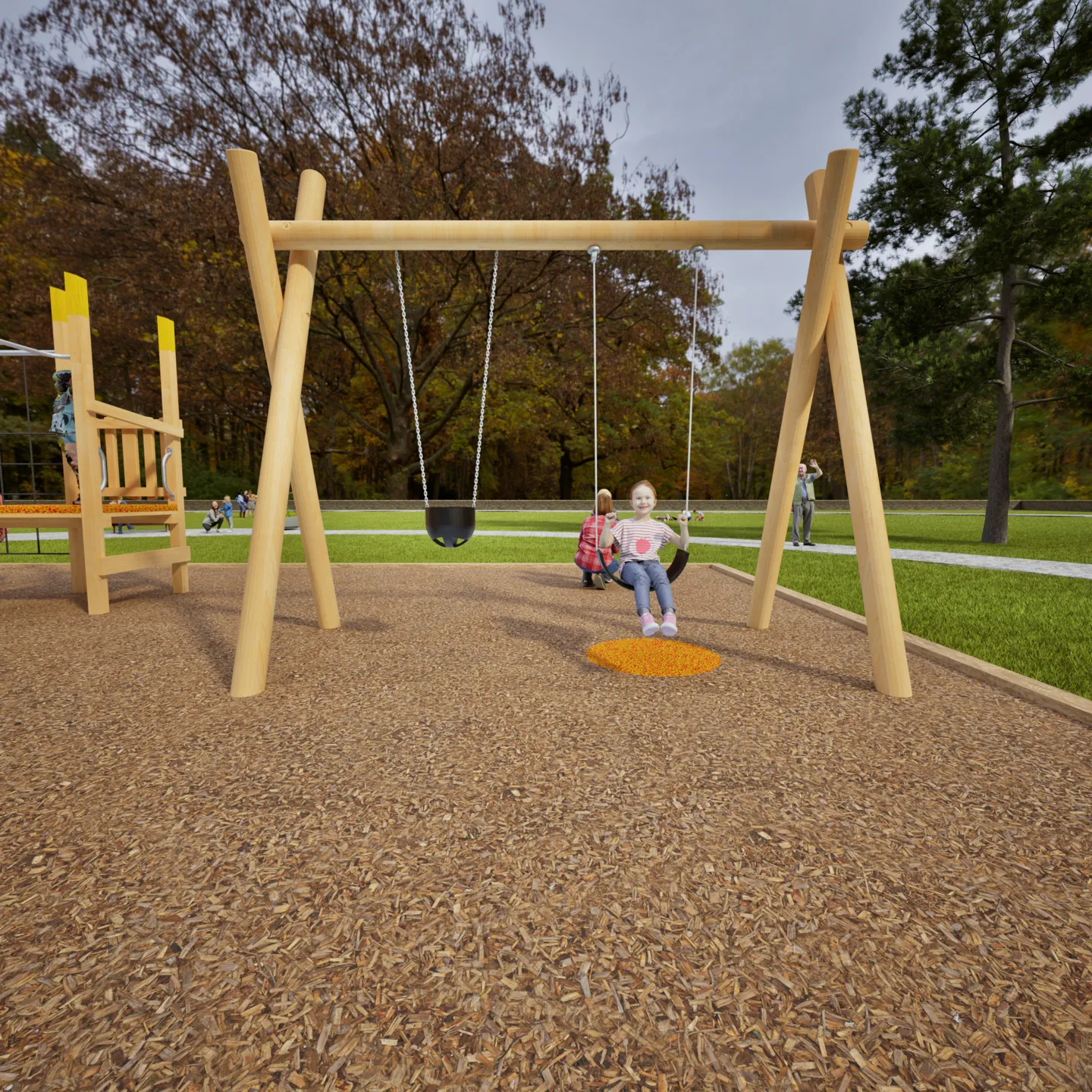 - Certified safety surfacing (combination of woodchip and Pour’n’Play rubber)