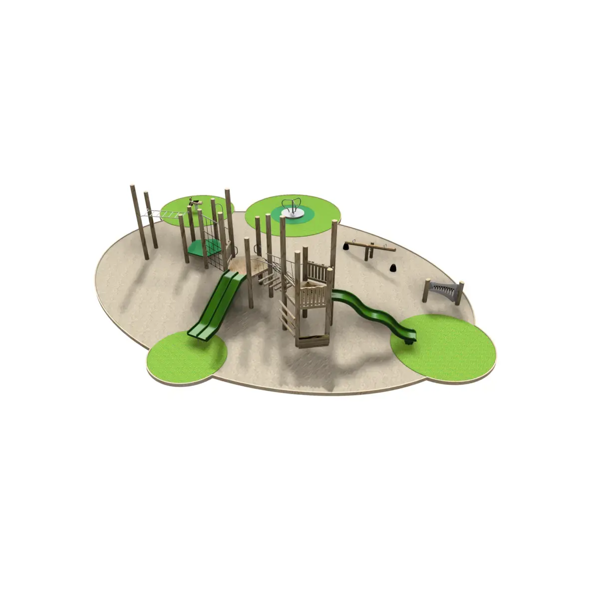 This package delivers a vibrant outdoor area that promotes physical challenge, coordination, creativity, and social interaction for up to around 25–30 tamariki at once. The substantial modular climbing structure offers varied heights and routes for exploration, building strength, balance, and imaginative play for older users. A standing carousel brings group spinning excitement, encouraging shared laughter and movement. The single seesaw supports turn-taking and teamwork, while the Robinia music play panel sparks sound discovery and creativity for younger tamariki. A bike springer provides simple, joyful bouncing accessible to all ages. With multi-height design (600mm, 1200mm, 1800mm zones), a combination of certified woodchip and Pour’n’Play rubber surfacing, sturdy timber edging, full installation, safety fencing, and a Site Specific Safety Plan (SSSP), it meets New Zealand standards for safety, durability, and accessibility. Ideal for local parks, schools, and councils seeking robust, low-maintenance solutions that nurture aroha for play, respect for whenua, and mana through active, inclusive fun.
