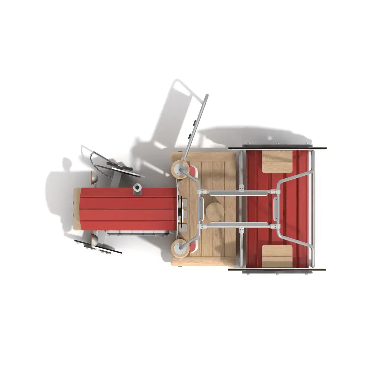 Ignite farmyard adventures in outdoor spaces with this compact tractor structure, tailored for tamariki 1 to 8 and fitting 11 at once. Measuring 2.7m long by 1.9m wide and 1.9m tall, it includes a tunnel as rear wheels, a dashboard with rotatable steering wheel, fuel and oil gauges, gear shift, and side mirrors for role play. Interactive panels feature turning pistons to mimic engines, racing tracks for small cars, and a rotating front wheel with chain linked spanner to hone manual dexterity and motor skills, while benches and a robinia seat foster whānau chats and emotion regulation.