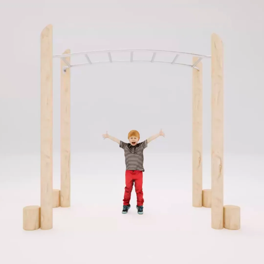 This traditional monkey bars setup provides a straightforward yet engaging overhead traverse where children hang, swing, and progress bar by bar, developing arm strength, shoulder stability, core engagement, and perseverance. It sparks friendly competition while remaining inclusive for different skill levels, allowing tamariki to challenge themselves at their own pace or cheer others on. Ideal for promoting physical fitness and hauora through dynamic, full-body activity, it suits the 5-12 age group and accommodates 1-2 users simultaneously in a compact footprint. Constructed with durable hot-dipped galvanised brackets for secure longevity in New Zealand’s variable climate, the equipment supports practical playground efficiency and integrates into natural or structured taiao. The required area of 4.93 x 6.07 m makes it suitable for space-conscious sites like school playgrounds, council parks, or landscape projects. With a focus on swinging, strengthening, and building confidence, it fosters whanaungatanga as children share the challenge and celebrate achievements together in a low-risk, high-reward environment.