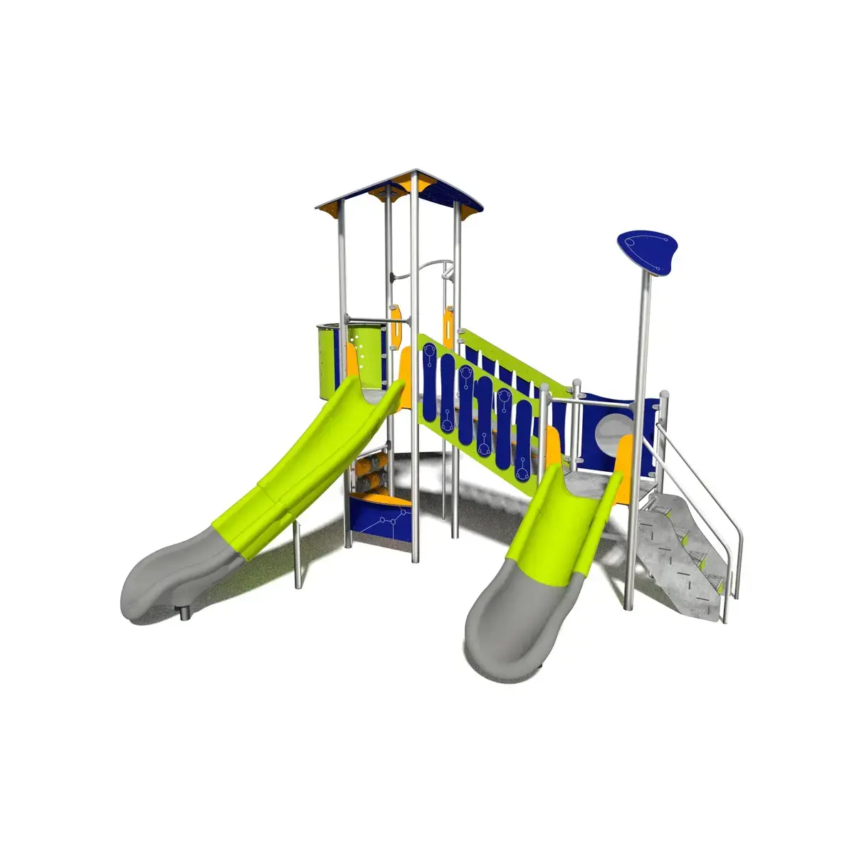 This Aquarius Inox series set combines platforms, slides, climbing elements, and bridges for dynamic, imaginative group play that supports motor development, teamwork, and resilience with progressive features for young tamariki. Featuring stainless steel columns and frames for superior corrosion resistance, UV stability, and longevity with minimal maintenance, plus recycled and natural materials for sustainability. The critical fall height simplifies surfacing compliance under NZ playground standards, while the large capacity handles busy community use. Ideal for councils creating eye-catching public play hubs, schools fostering inclusive growth, or landscape architects designing modern, colourful spaces that promote ora, exploration, and whānau connections for tamariki.