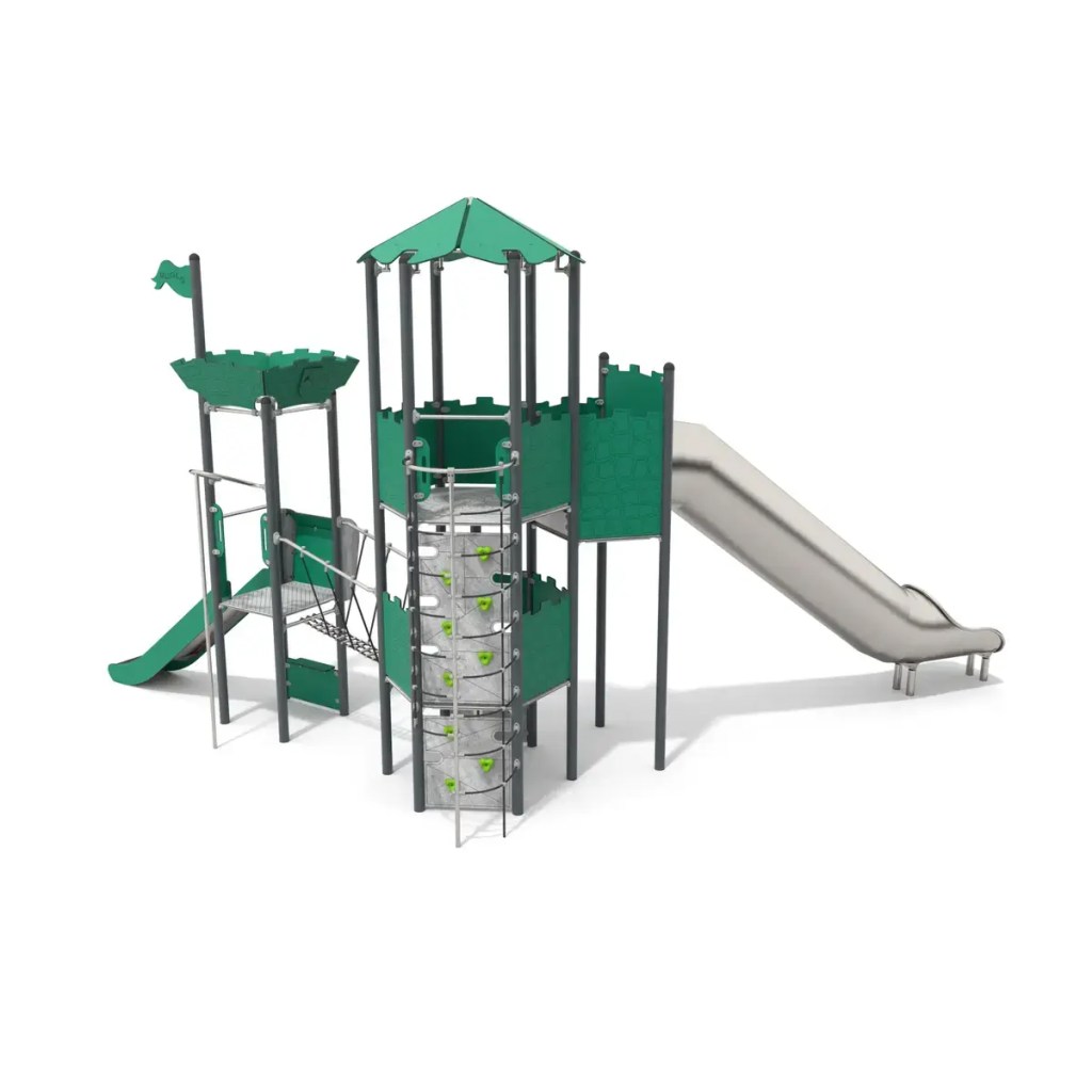 This recycled playset offers three-track adventures including climbing walls to strengthen physical endurance and perseverance, varied textures for sensory integration and perceptual development, thrilling slides for dynamic descents, and a bridge for social interaction that fosters cooperation and relationships among tamariki. Constructed with post-consumer recycled materials and sustainable natural components, it reduces environmental impact while providing robust, low-maintenance equipment suited to New Zealand’s outdoor conditions. Compliant with EN 1176 standards, it provides inclusive challenges for different abilities in a colourful, nature-inspired design that promotes resilience, teamwork, and connection to the whenua. With a total height of 3.27 m and a safety zone of 7.02 m × 8.46 m (42 m²), it fits medium sites prioritising eco-conscious, high-engagement play that educates on recycling and caring for the planet in a safe, fun format.