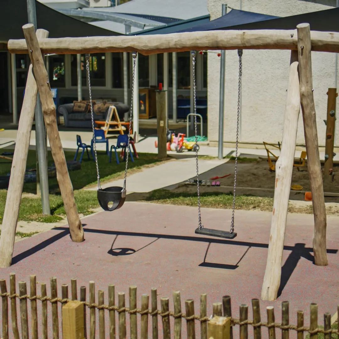 This versatile single-bay swing provides two seat choices in one setup: a wide belt seat for older tamariki who pump and swing freely, and an enclosed infant seat for younger ones needing secure support. It delivers the timeless back-and-forth action that develops coordination, core strength, spatial awareness, and sensory regulation while offering soothing vestibular input to help with focus and emotional calm. The dual-option design makes it highly inclusive, allowing siblings or mixed-age groups to play together safely and accessibly, with clear turn-taking that builds social skills and whanaungatanga as children wait, cheer, or swap seats. Constructed with a robust hot-dipped galvanised steel frame and chains for corrosion resistance and long-term reliability in our salty coastal air, heavy rain, and strong sun, the equipment integrates into natural or structured taiao with low maintenance needs. With product dimensions of 3.95 x 1.7 x 3 m, a fall height of 1.6 m, and a required safety area of 7.9 x 3.95 m, it suits compact sites like school playgrounds, council reserves, or landscape projects while delivering high play value through adaptable, joyful swinging that supports overall hauora in a safe environment.