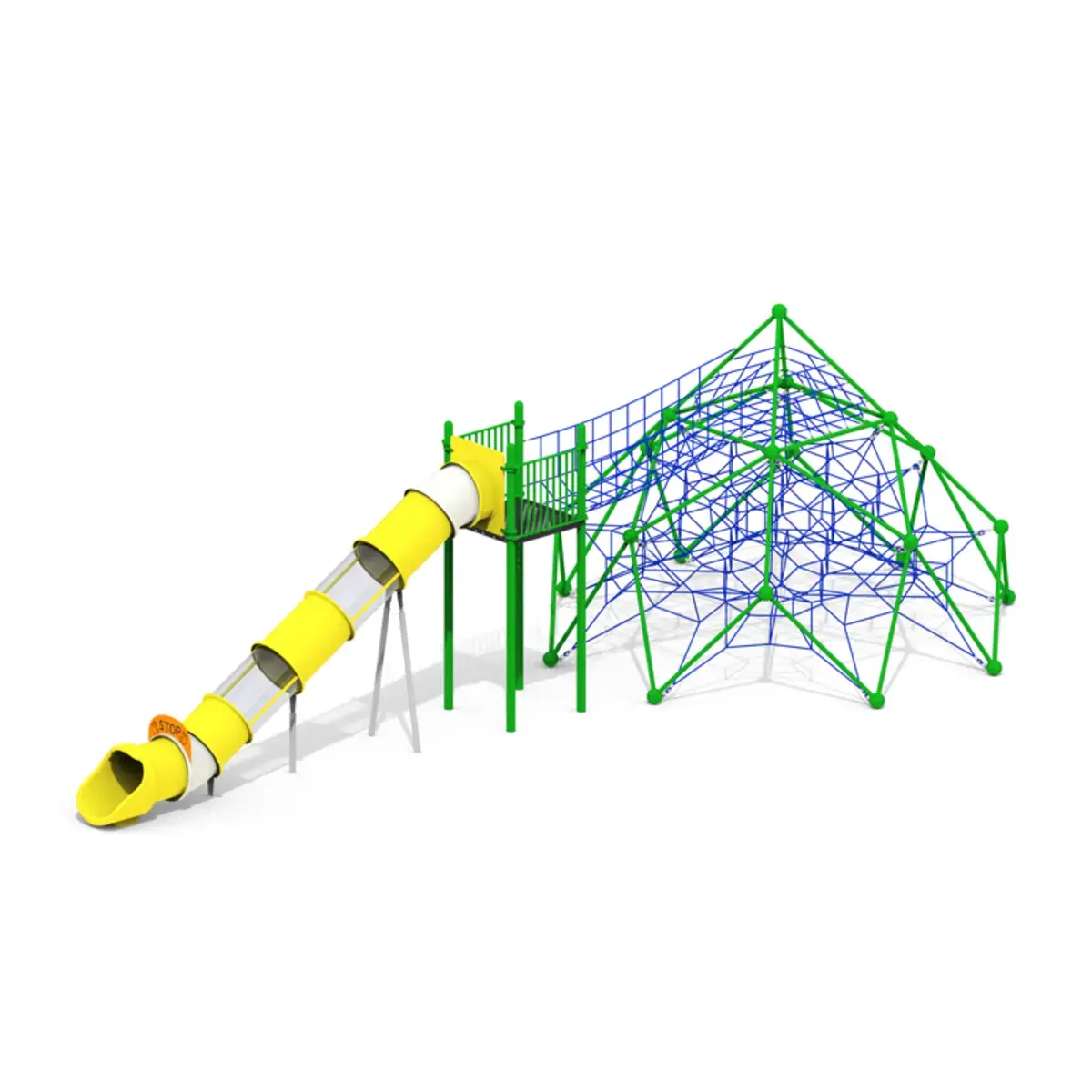 Designed for active play, this structure combines climbing nets and a slide to challenge and delight tamariki from 6 to 12 years old. Constructed from high-quality powder-coated steel posts for strength and longevity, the polyamide ropes are reinforced with steel strands for safety and durability against New Zealand’s varied weather. Textile-reinforced rubber post shields prevent entrapments, while aluminium ball knots and steel turnbuckles provide secure joints. The UV-protected LLDPE slide ensures smooth, fade-resistant fun. Accommodating up to 42 users, it encourages group interaction, building mana through shared adventures and physical development. Compliant with EN 1176 standards, it minimises risks with a 2.57 m fall height and generous safety zone. Perfect for councils seeking low-maintenance equipment that integrates seamlessly into landscapes, this playground promotes health and wellbeing for whānau. Invest in spaces that inspire aroha for outdoor play.