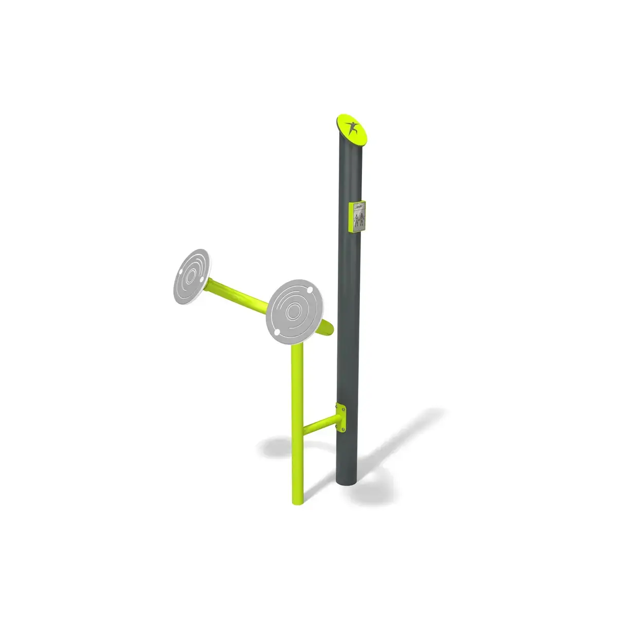 This durable standing shoulder rotator allows users to perform smooth, controlled circular rotations with arms extended or bent, targeting rotator cuff muscles, shoulders, and wrists to improve range of motion, reduce stiffness, and aid rehabilitation or warm-up. Its design suits all fitness levels for individual or group use in council parks, school grounds, or landscaped recreational zones. The compact build fits smaller sites while requiring a standard safety zone per standards. It withstands New Zealand’s weather with robust, low-maintenance construction, accommodates multiple users (typically 1-2 simultaneously), and complies with PN-EN 16630:2015 for safety. Key specs: required area of 3.87 x 4.06 m (13 m²), product dimensions of 0.87 x 1.06 m with total height 2.00 m, free fall height of 0.00 m (ground level), capacity for several users, age range from around 5+, and materials of stainless steel with high-quality fitness components for longevity and reliability.