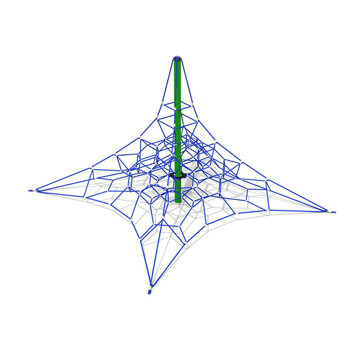 Every component is engineered for longevity. The main support post is 139.8 mm powder-coated steel tubing. Climbing ropes are 20 mm diameter polyamide (nylon) with UV protection and fire retardant treatment, each reinforced with 144 galvanised steel strands. Ball knots are compressed aluminium, set with 667 kN of force. Turnbuckles are steel alloy rated to 390 kN. All fasteners are stainless steel.