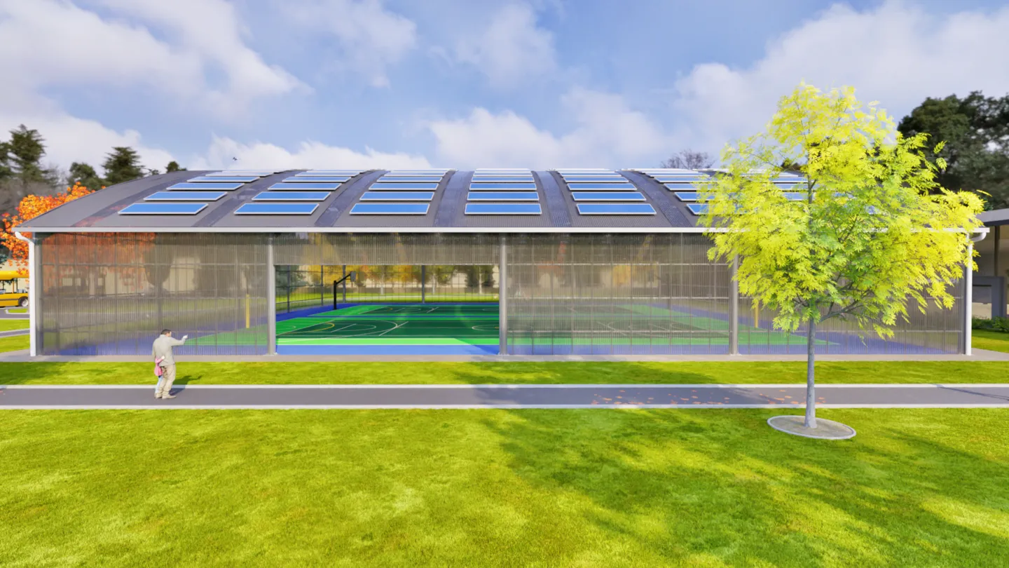 This structure is 45% more affordable than conventional gymnasiums while still being multi-use and multi-sport. Engineered steel framing and enclosed panels outperform fabric canopies, keeping the space dry and comfortable in all weather.
