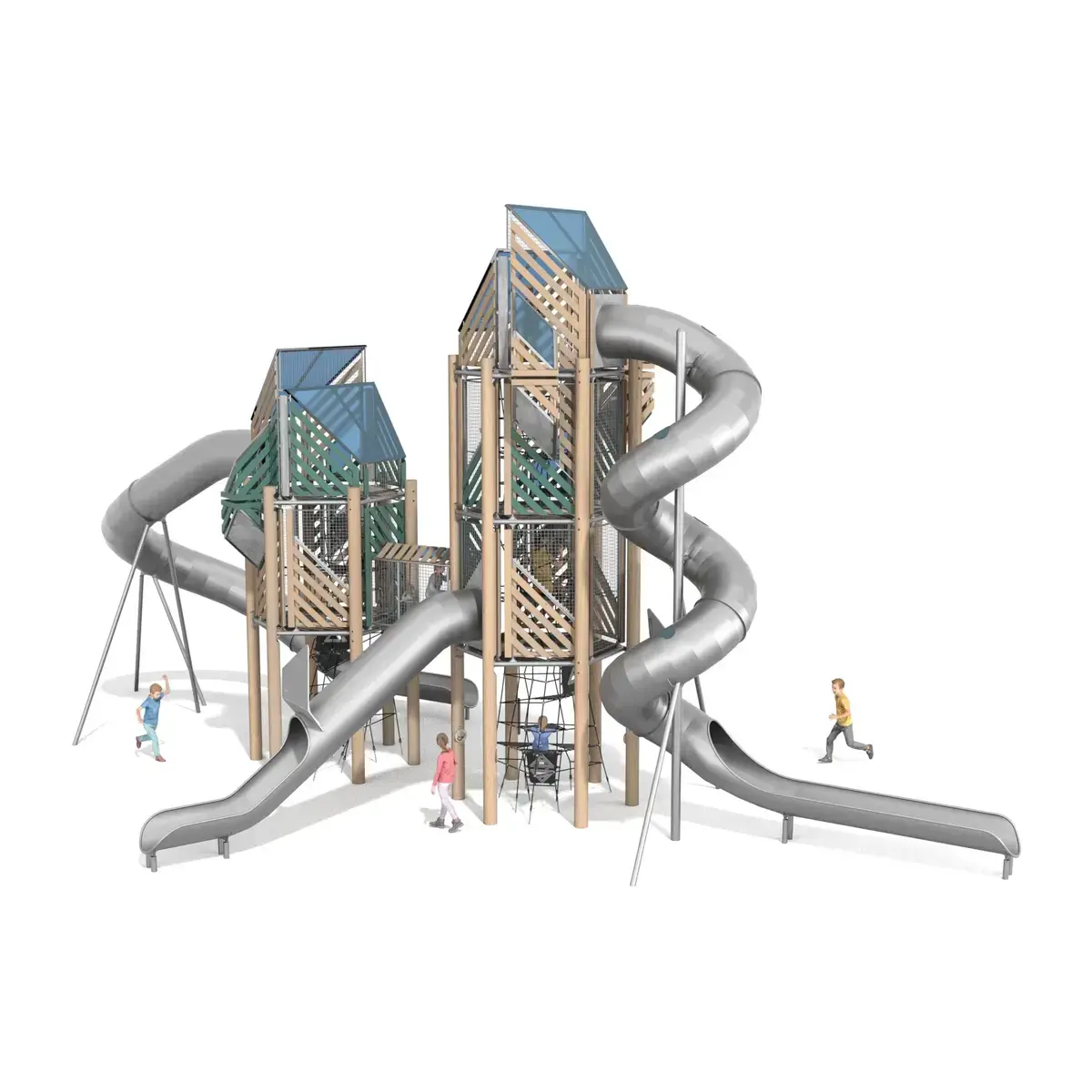 $604,288This three-tower playground set delivers multi-level adventures with climbing nets, slides, and linking passages for kids aged 3-12, holding up to 65 users. Covering 15.9m x 9.8m and reaching 8.8m high, it includes hexagonal and square towers with roofs and bridges. Made from tough robinia wood, stainless steel, and UV-stable polycarbonate, it’s built for New Zealand’s wet and sunny conditions. Complies with EN 1176 standards, needing a 2.1m safety surface.