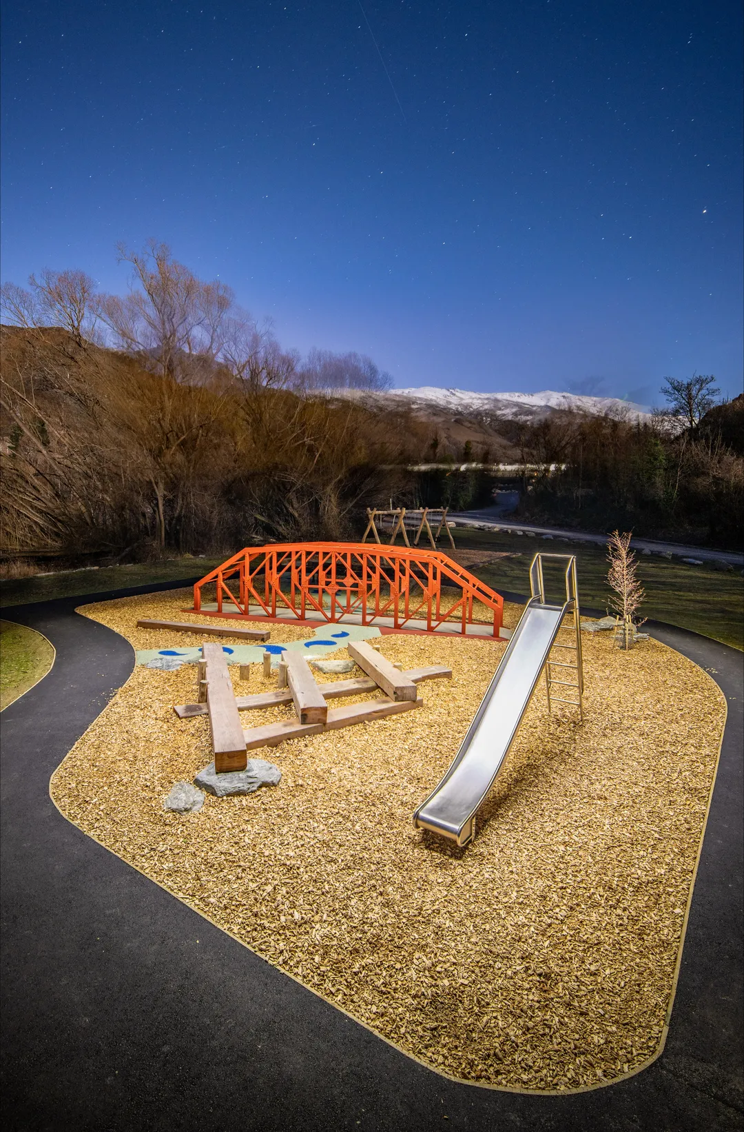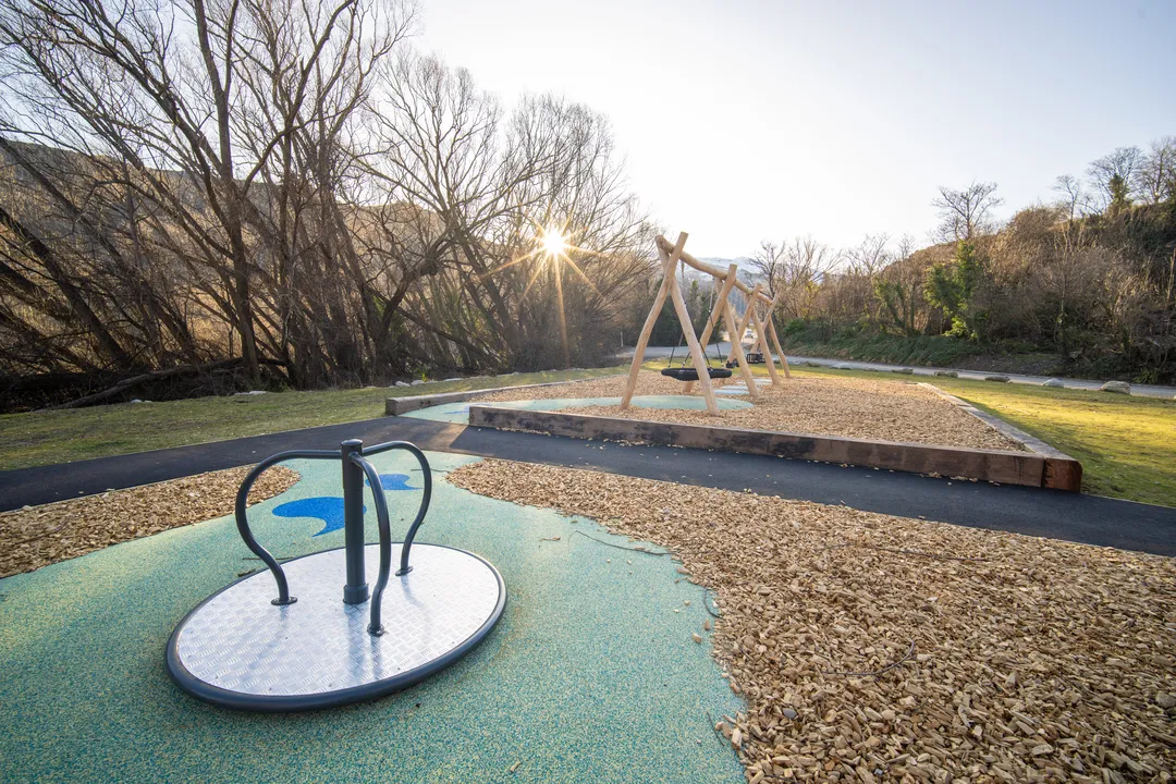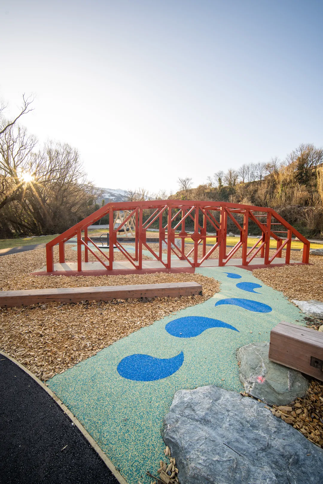A swing set, balance beams, and carousel equipment pieces are focal points in the playground, creating a range of activity opportunities for visitors while playing on the river movement theme, while the concrete track surrounding the new space is perfect for children to ride bikes and navigate around the playground.