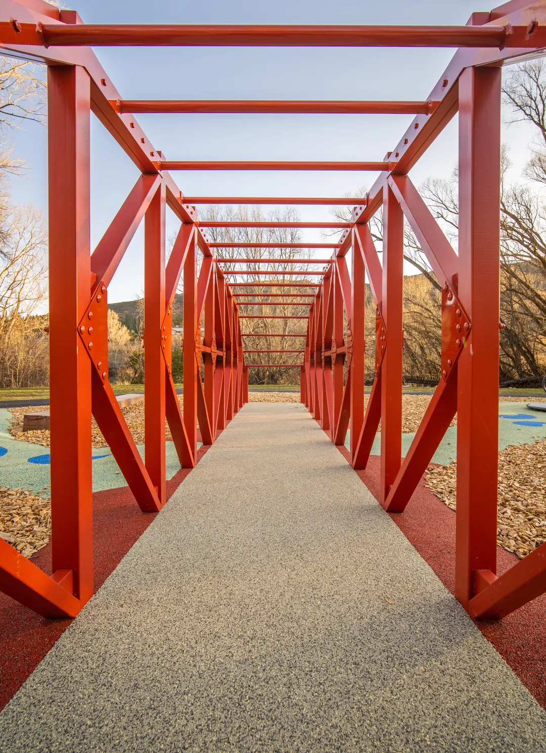 Creo constructed a small replica of the Clyde Bridge to be used as a play equipment piece, with bars for climbing on and a river design underneath that brings a sense of the surrounding environment. By using wet-pour rubber surfacing, the Creo design and build team were able to create a river/water-like design that flows throughout the space and brings a fun and colourful element.