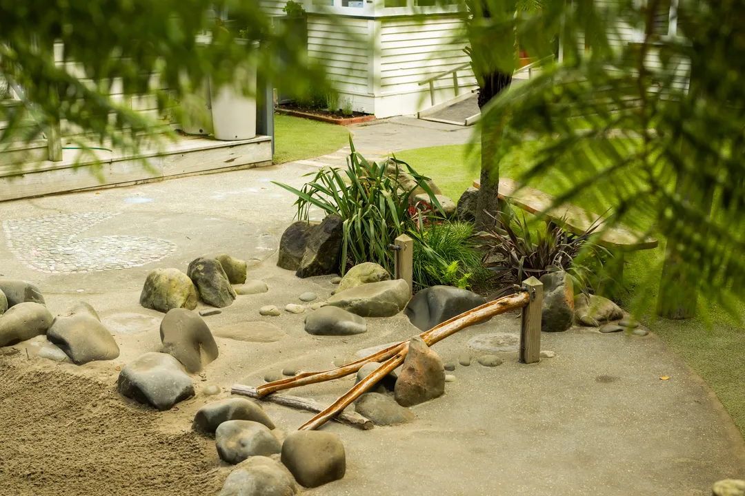 The new play space follows a nature-inspired design that provides a range of different play types using both existing and new natural elements. The site features an interactive mud kitchen, a large sandpit, balancing logs, a water-rock play area, little huts sheltered in the perimeter of the space, central plantings, some flexible play equipment and even a little area for the under twos that keeps them safe while still making them feel part of the playground. Centre manager Megan says the children love to play in the open space.