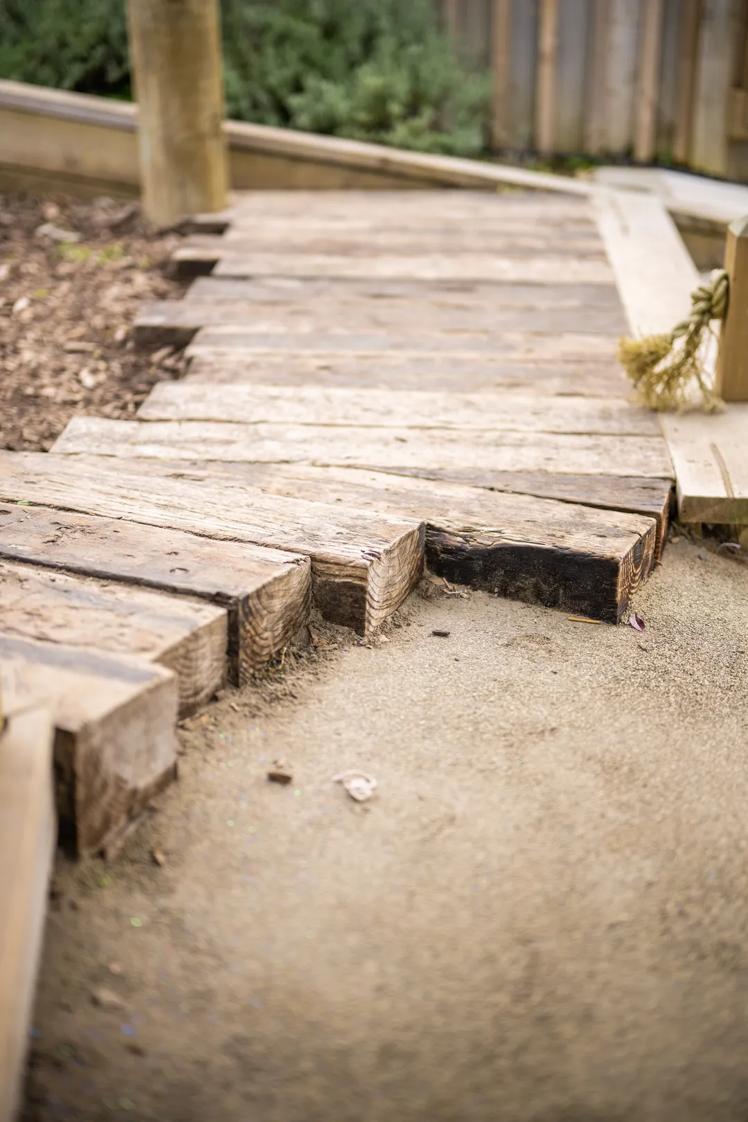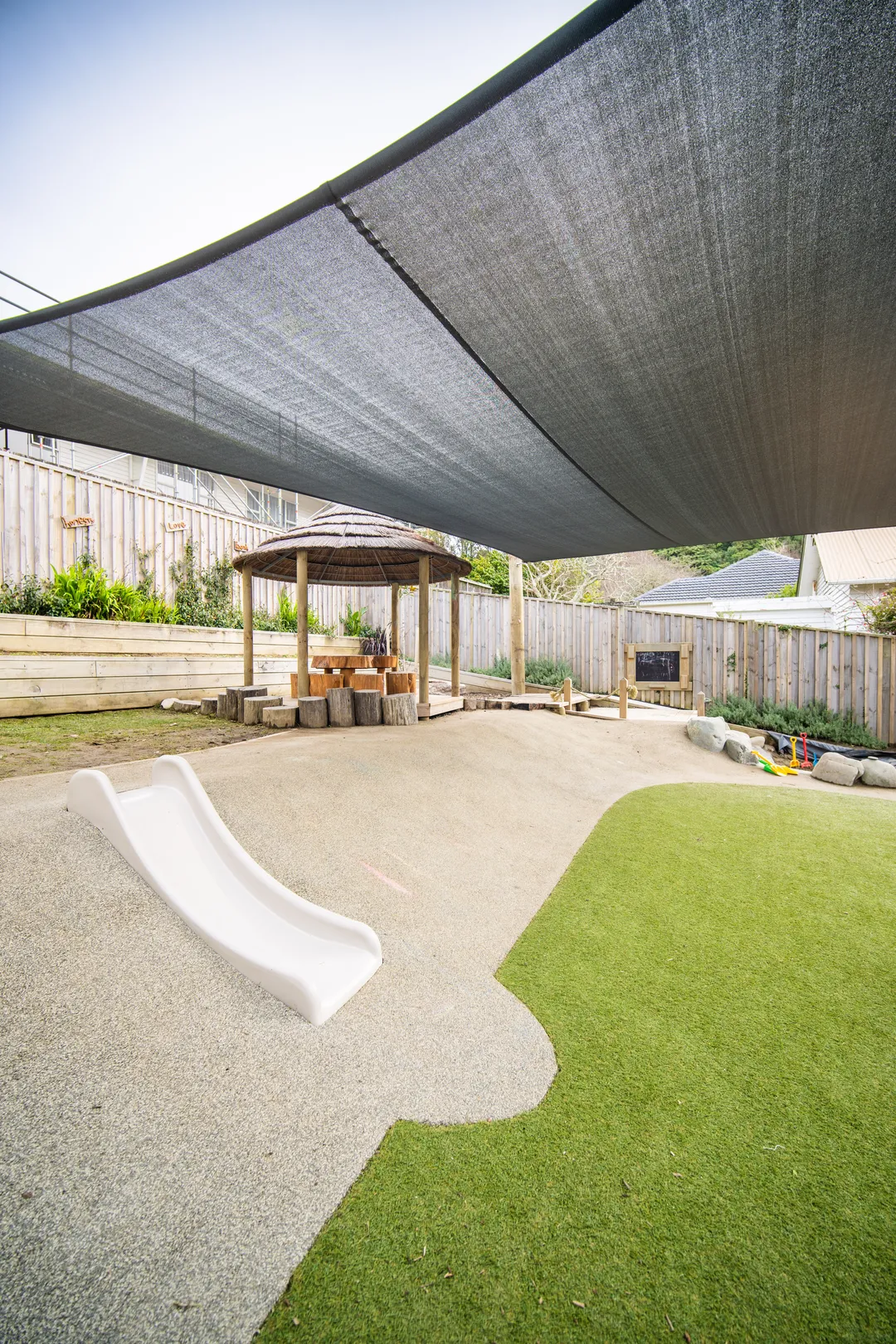 Keeping with a natural look, Creo selected play pieces and features that would fit within the colour palette and textures the preschool wanted in the space. The natural inspiration also translated into the use of natural-based play experiences like the timber logs, the mud kitchen, the sand pit, the water play area, the garden, and the turfed space.