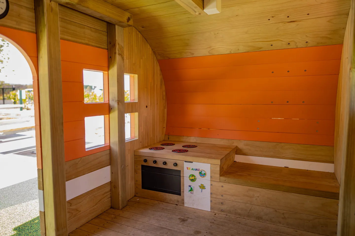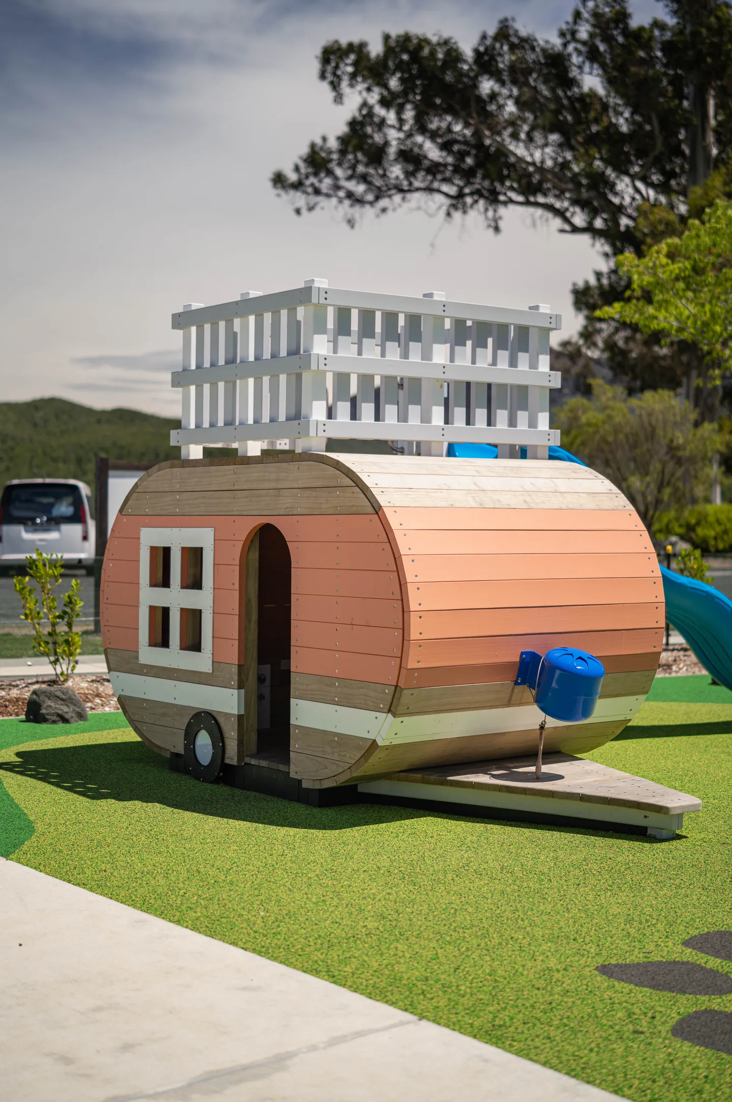 This whimsical play structure, designed to evoke the spirit of road trips through Fiordland's landscapes, serves as a cozy hideaway for imaginative role-play.