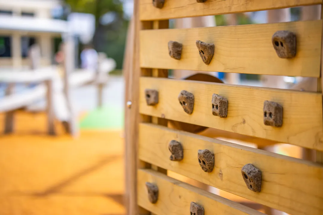 The Robinia wood equipment structure adds a unique element to the playground, providing a range of play types, including sliding, balancing, climbing, and a hanging-out area. The informal play type on the Robinia equipment adds to the overall natural and free-play feel of the playground.