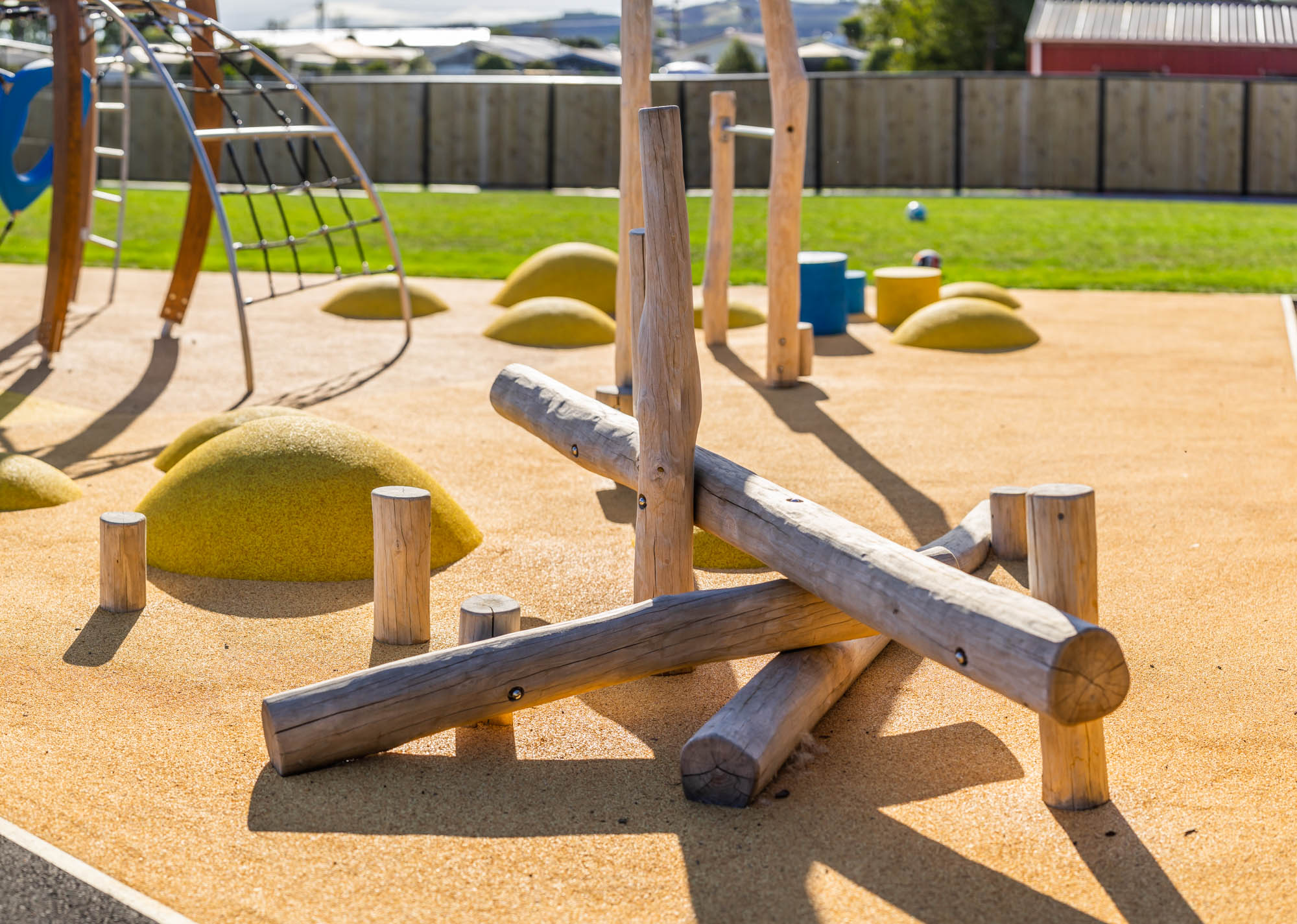 The play space has a range of height play options which Sarah explains that the kids at her school love. The variety of climbing opportunities throughout the playground keeps students entertained and encourages physical activity and competition. A range of balance play options can also be found in the playground, with mounds, and steppers scattered around the space, creating fun games, and challenges, pushing kids to get creative with their playtime.
