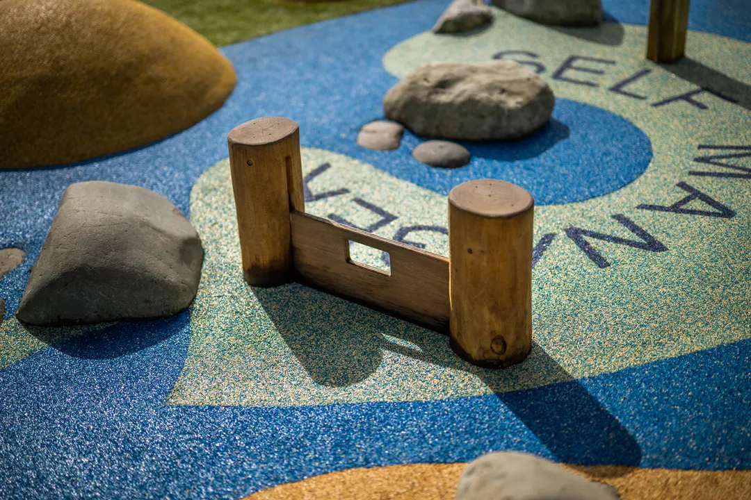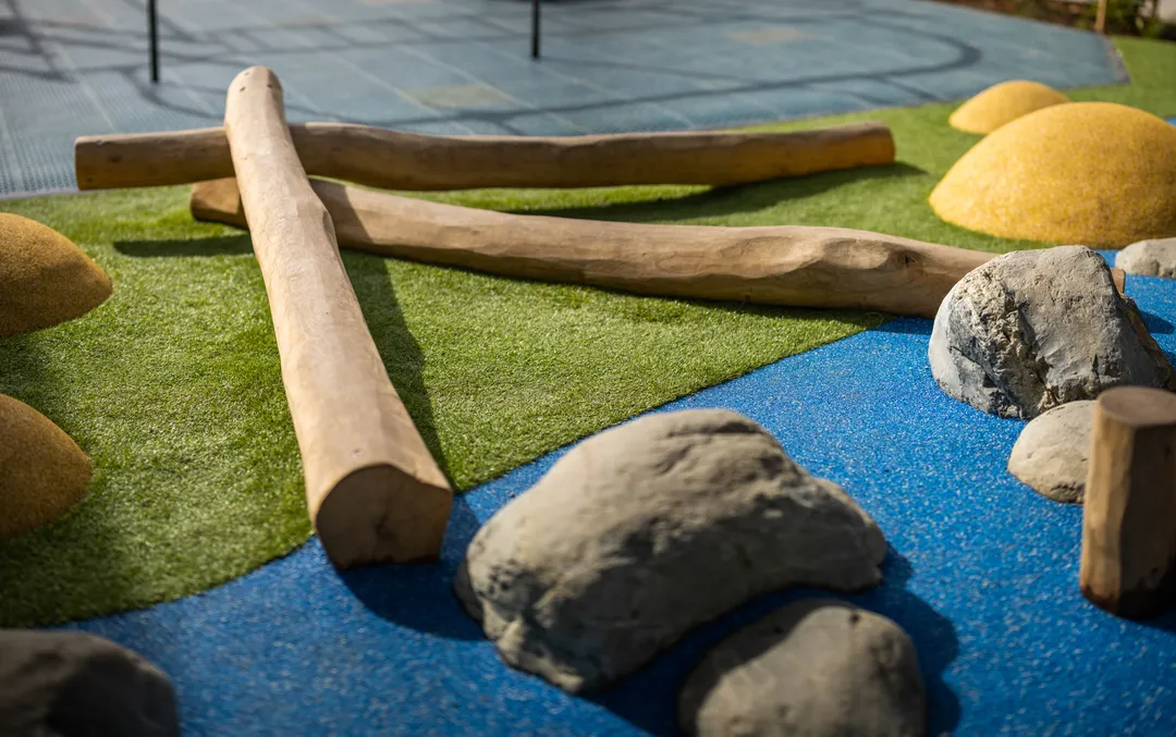 Celebrating the natural and coastal environment of the school, the new play space features water play, mounds, rocks, balance beams, and landscaping. It has become a fun and calming space where students can play, eat their lunch, and do their schoolwork.
