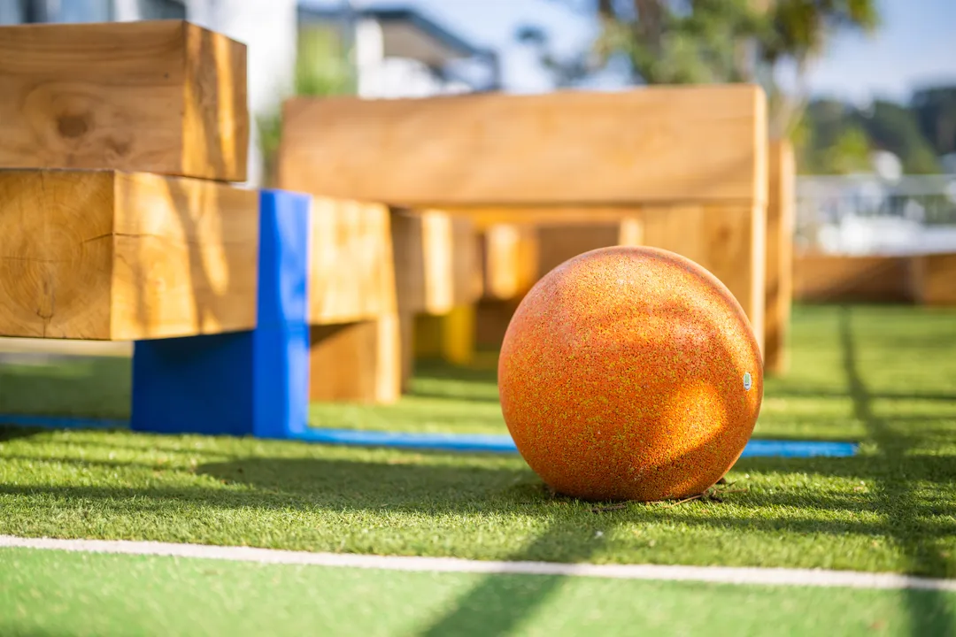 The colours used throughout the design of the space echo the themes running down the walls of the school, while the ground markings unlock a world of play opportunities for games and learning. There are various play elements in the new space, including balance balls, wooden beam structures, ground markings and plenty of free space for running around.