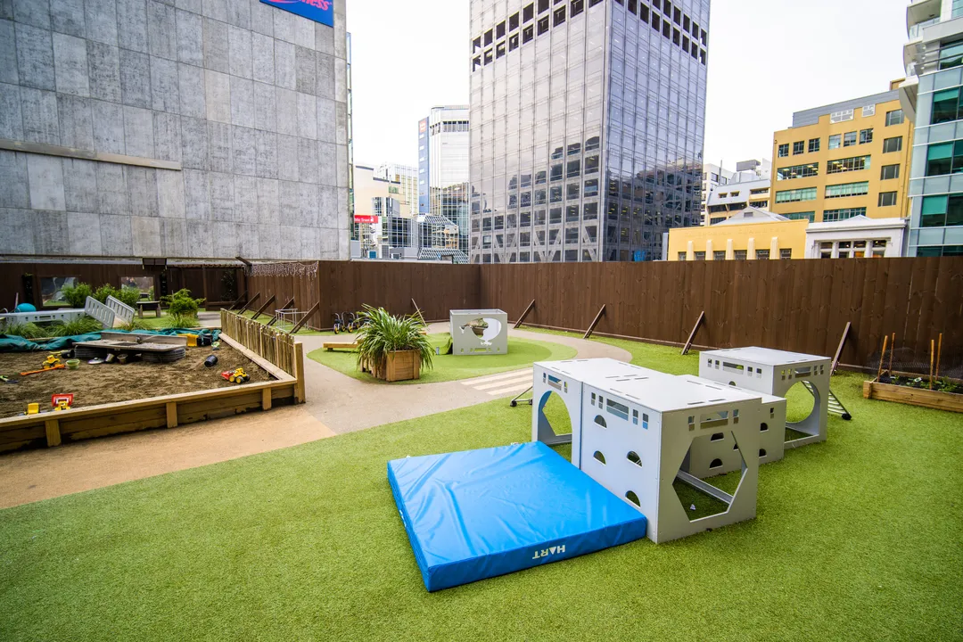 The play space at Tiny Voices in the Wellington CBD is a unique project, capturing the most beloved playtime elements and bringing them to a rooftop setting.