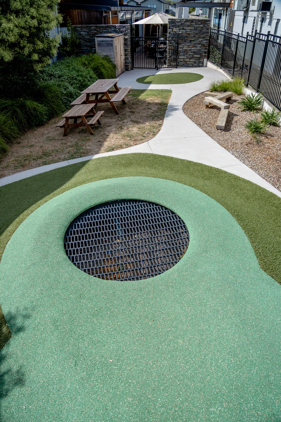 The courtyard space needed good drainage, a play area that was hard-wearing, and would last the countless visitors and traffic.