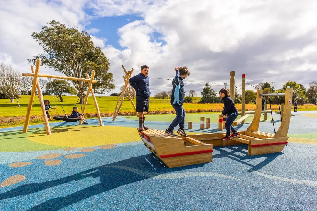 The implementation of the local culture is vital for the playground. We designed and built a Marae tower and a waka for the children. Inclusivity was also considered when designing the play space at Whitikau Reserve Playground. Th et-pour rubber surfacing is fully accessible, and the waka has space for children of all abilities to play.