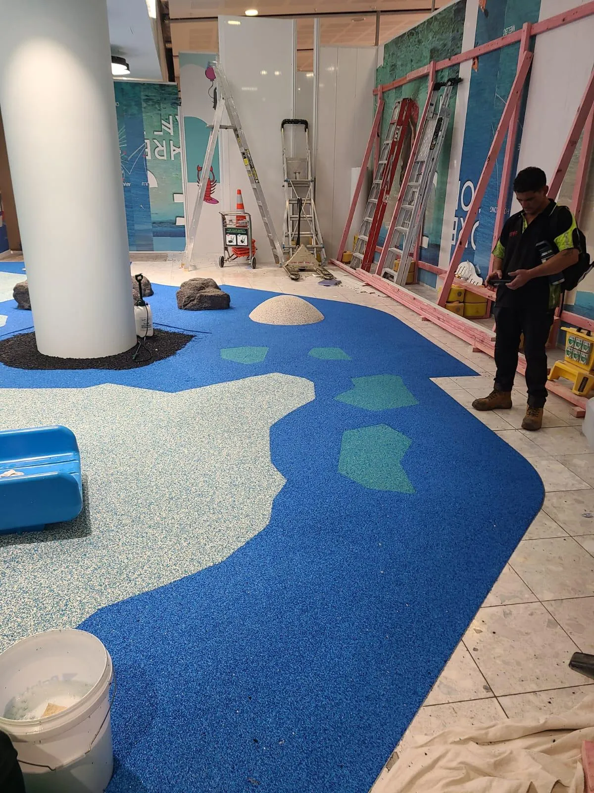 In progress: 100m2 Pour’N’Play top layer in various colour mixes being installed.