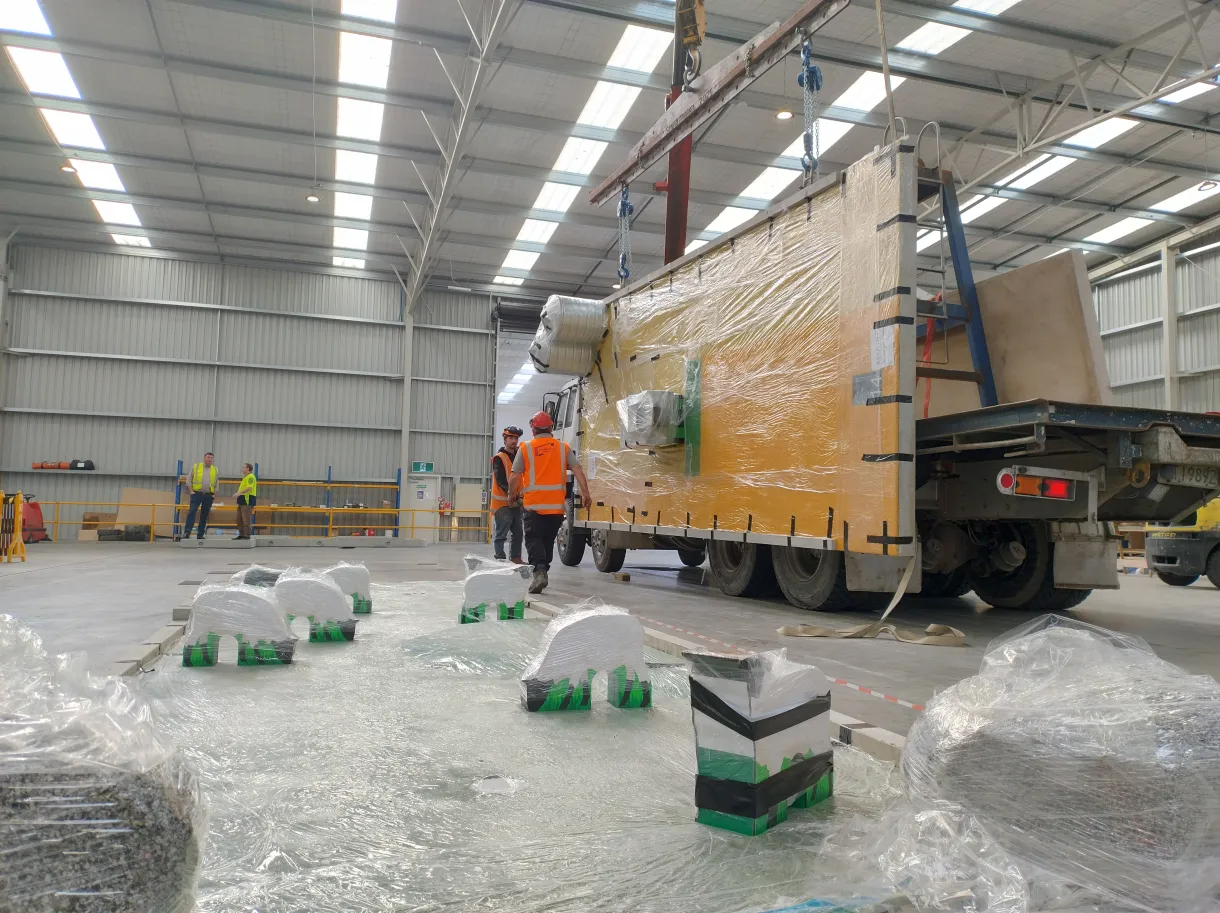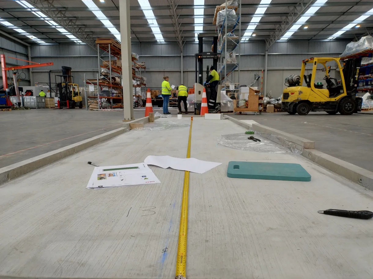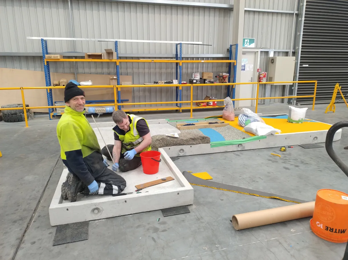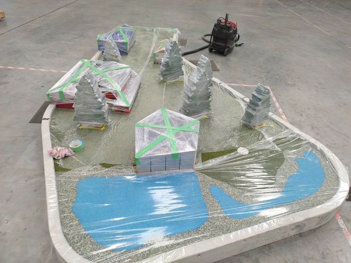 - From here, it’s a weekly rhythm: two blank concrete slabs arrive for on-site finishing, while two prepped slabs get placed and themed.