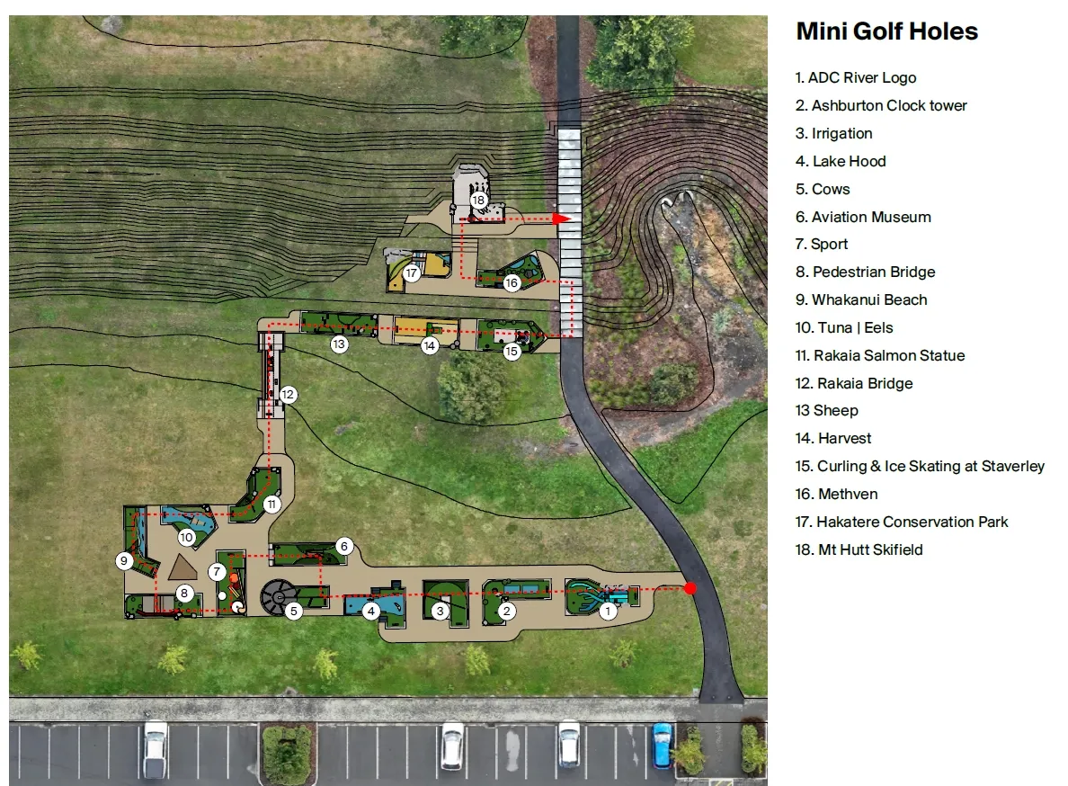 Themed around local icons like the town clock, combine harvesters, braided rivers, and Mt Hutt. It’s family-friendly, accessible, and built to last—turning a grassy embankment into a free community hub for putts and laughs.